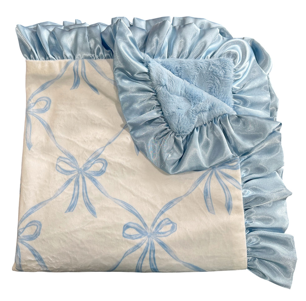 Wrap your little one in pure softness with this dreamy baby blue plush minky blanket. Designed for both comfort and style, this blanket features an ultra-luxurious textured minky fabric that feels incredibly gentle against delicate skin. The elegant satin ruffle trim adds a touch of sophistication and charm, making it as beautiful as it is cozy.